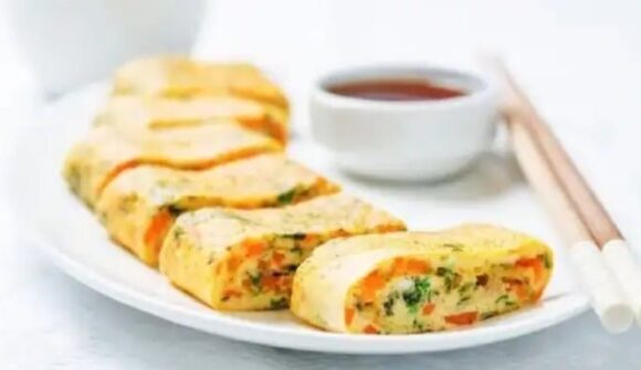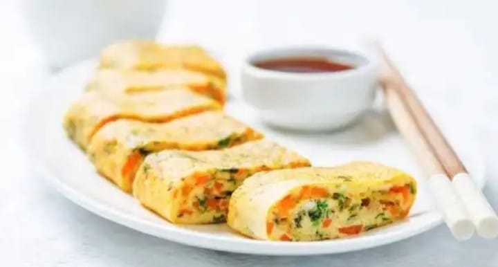 - Mezcla las claras con el cebollín picado, coloca encima de las yemas en el sartén cuando estas estén a media cocción, coloca algunas tiras de zanahoria en el centro y empieza a enrollar desde las orillas del huevo para formar un rollo dejando en medio a las zanahorias.