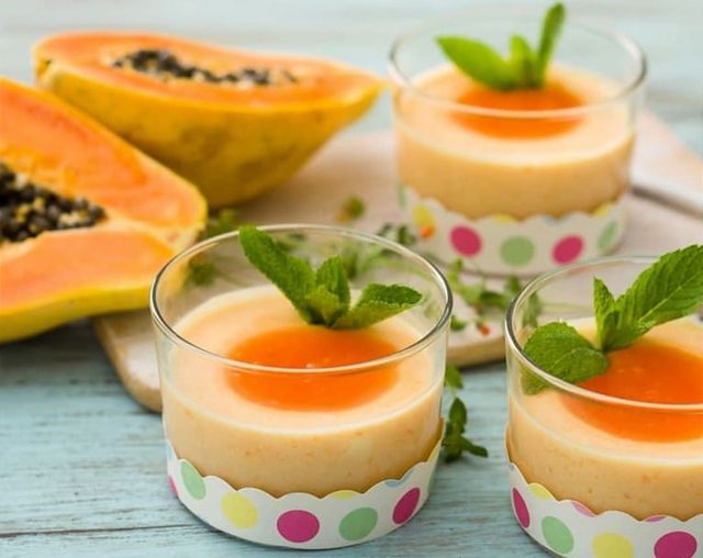 Decora las mousses con la papaya reservada cortada en láminas y unas hojitas de menta lavadas, y listo a disfrutar de tu Mousse de papaya con naranja.
