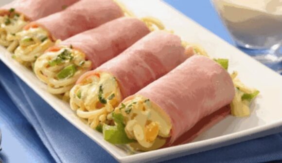 - Mezclar hasta integrar los ingredientes. Coloca un poco de espagueti sobre cada rebanada de jamón y enrolla, acomoda en un refractario y calienta en el horno de microondas por 5 minutos.