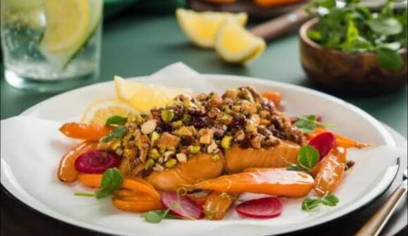 El salmón al horno con frutos secos es un pescado graso rico en Omega3 con propiedades saludables.
